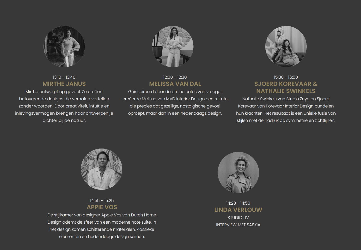Op de zaterdag zal er een reeks interviews worden afgenomen door Saskia. Zij gaat in gesprek met de ontwerpers achter de designwoningen. De interviews onthullen niet alleen hun unieke vormentaal, maar ook de weloverwogen keuzes die aan de basis liggen van hun creaties. Het is een verkenning van de persoonlijke stijl die elk van de designwoningen karakteriseert. De interviews vinden plaats volgens het onderstaande tijdsschema: