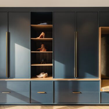 Maatwerk is dé manier om een interieur te personaliseren. De ruimte wordt optimaal benut en je creëert een uniek interieur. Het ontwerp kan precies passend gemaakt worden op de wanden, plafonds en zelfs op de schuine daklijnen. In deze kamerhoge kastenwand van Lew Interieur is de nachtblauwe UB02 Ovatta gecombineerd met een warme notenhout (structuur Poro Noce). Daarmee krijgt de ruimte meteen die ‘hotelchique’ beleving. Leuk detail in het ontwerp is de nis waar je in kunt zitten om je schoenen aan te trekken.
