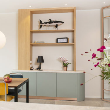 Deze multifunctionele kastenwand is uitgevoerd in de legergroene UB54 Ovatta. Naast opbergruimte zijn er nissen om te stylen en de grote verrassing is het logeerbed dat verborgen zit achter de houten lamellen. De combinatie van blond hout, legergroen en kerriegeel zorgt voor een natuurlijke sfeer.