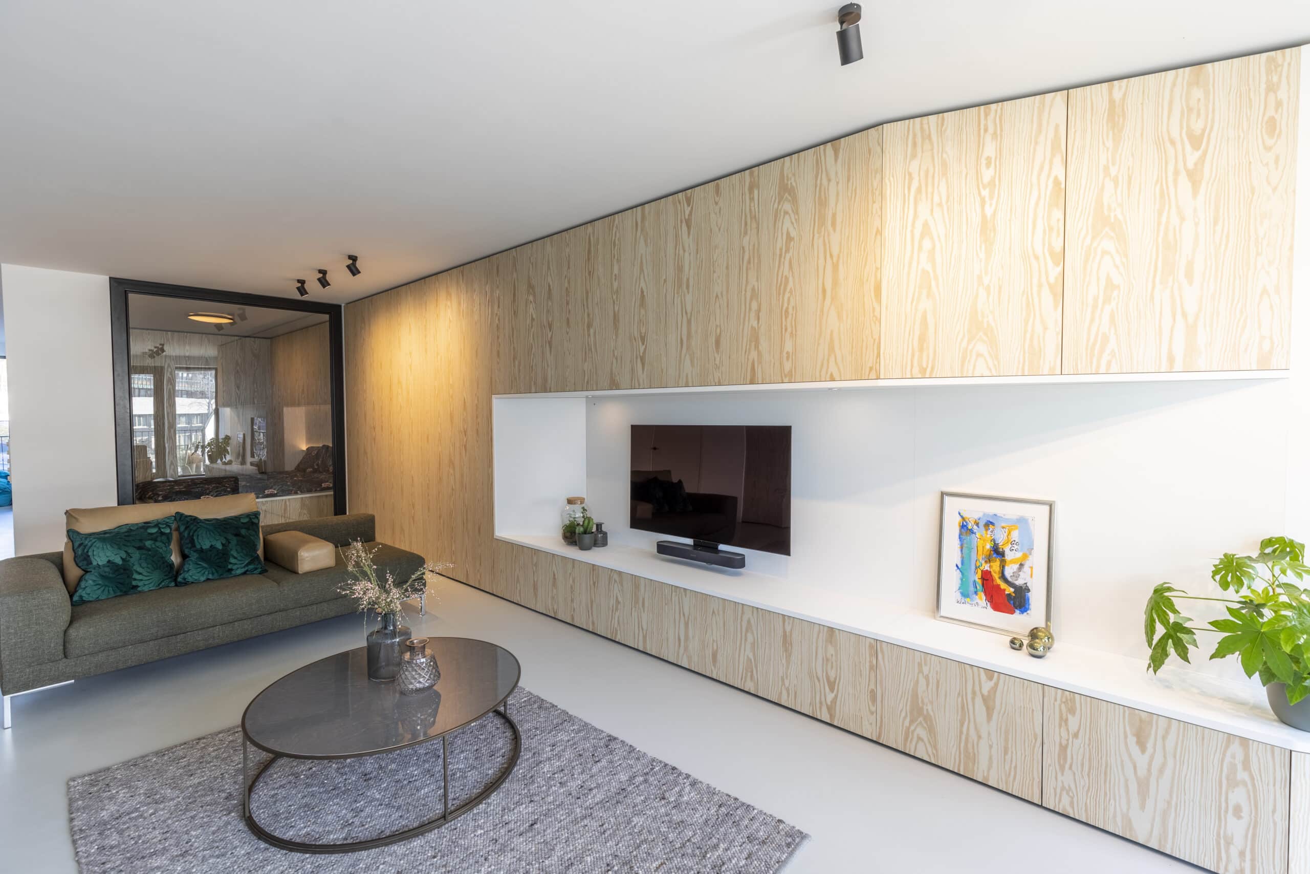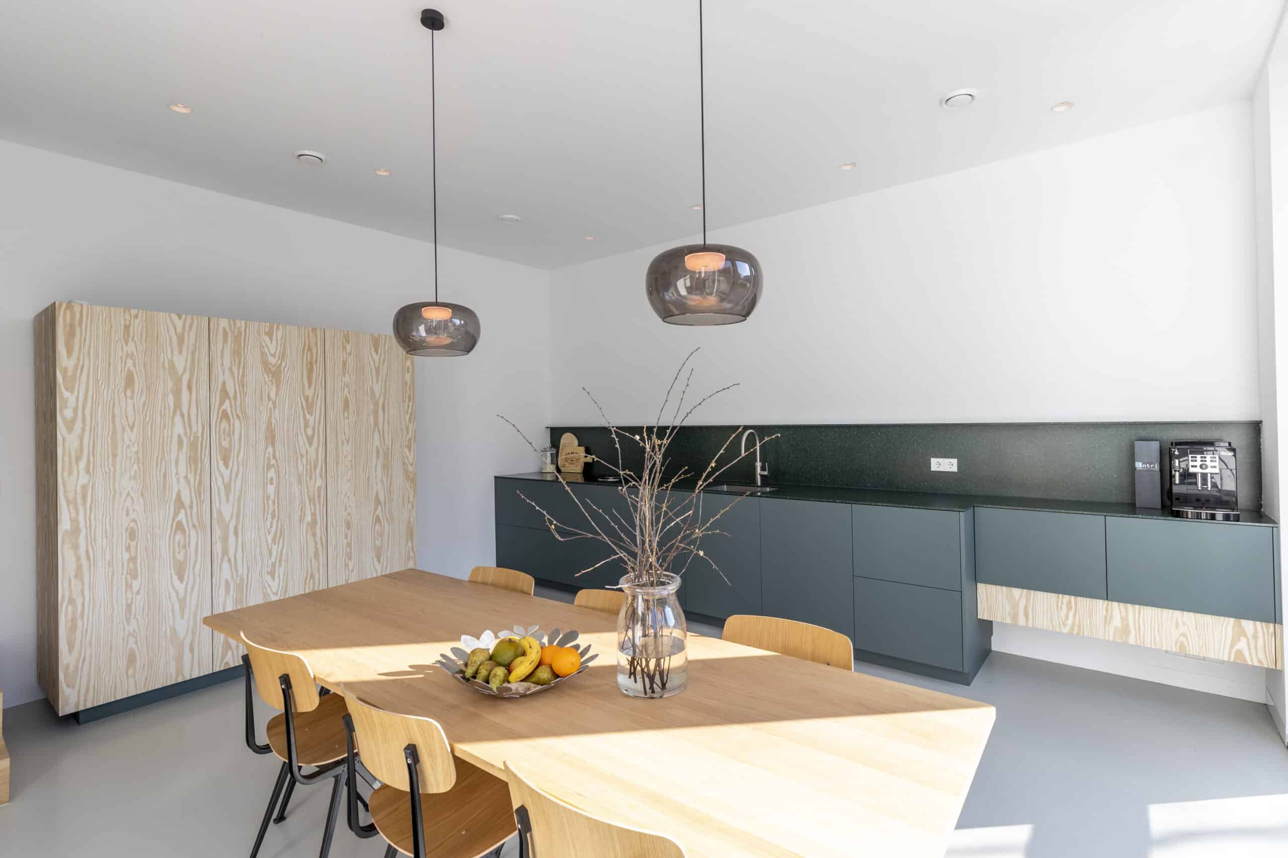 “Het komt ook voor dat een opdrachtgever zelf een materiaal bedenkt en daarmee afwijkt van hetgeen wij of de architect voorstelt. Een mooi voorbeeld daarvan is de keuken en de kastenwand die zijn uitgevoerd in de uitgesproken houtstructuur Millenium, die wat weg heeft van underlayment.”