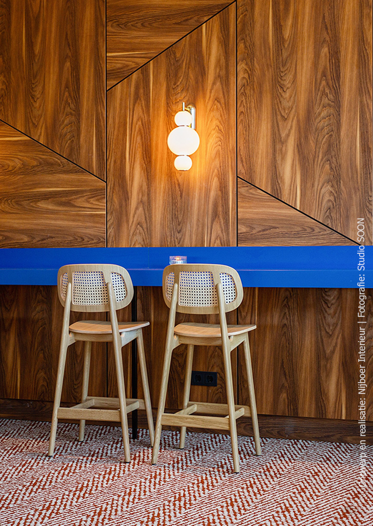 De Mid-Century stijl heeft zowel residentiële als commerciële ruimtes veroverd. Hotels en restaurants omarmen deze stijl ook, zoals te zien is in het Van der Valk Hotel Eindhoven-Best. Hier is in het restaurant de wandafwerking gerealiseerd met de warme S016 Yosemite. De speelse ornamenten in het restaurant, zijn gerealiseerd met de blonde S128 Pembroke. Dit decor is geïnspireerd op eikenhout.