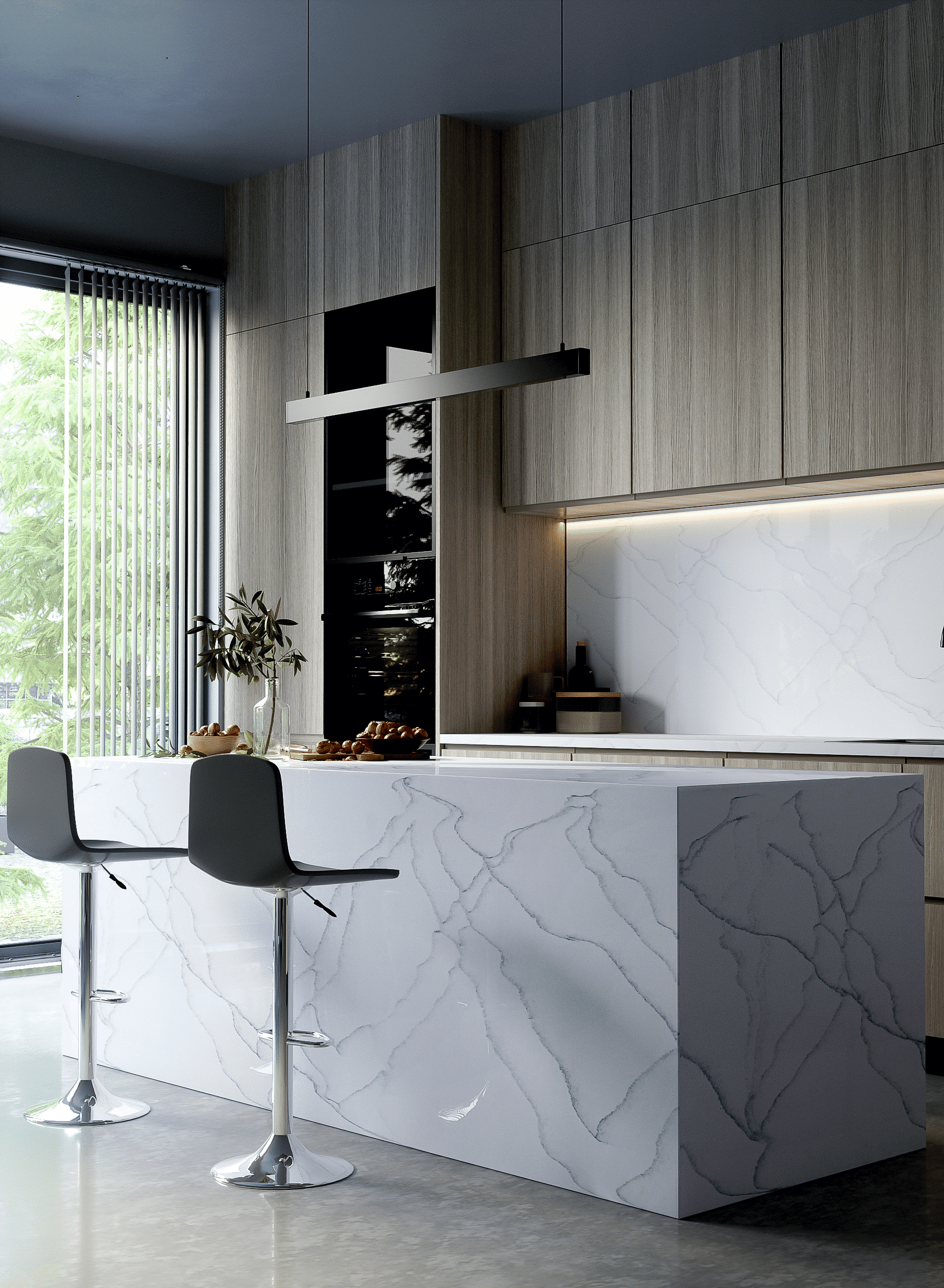 Solid surface decor DM5058 Blanca Carerra van Durasein®, voorheen PAW091 Blanca Carrera, is wit, doorbroken met grijze aders. Daarmee geeft het de beleving van marmer.
