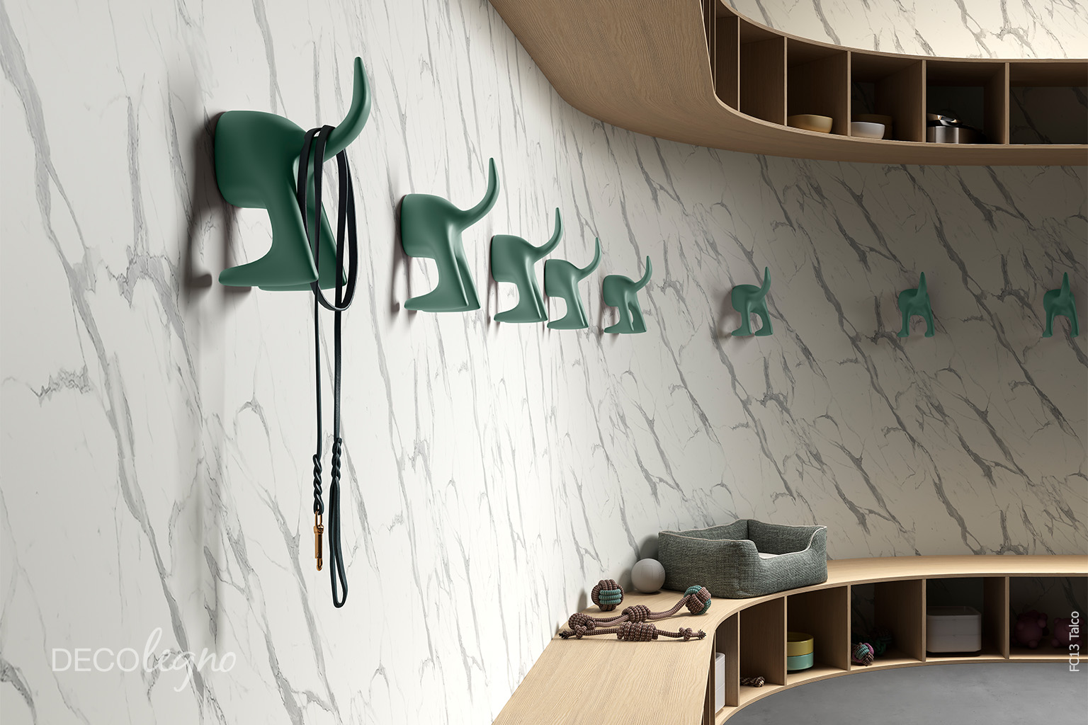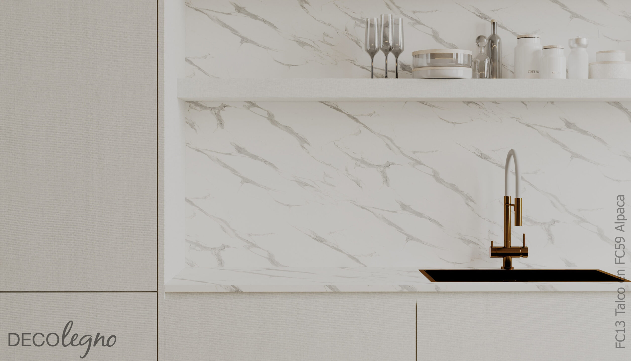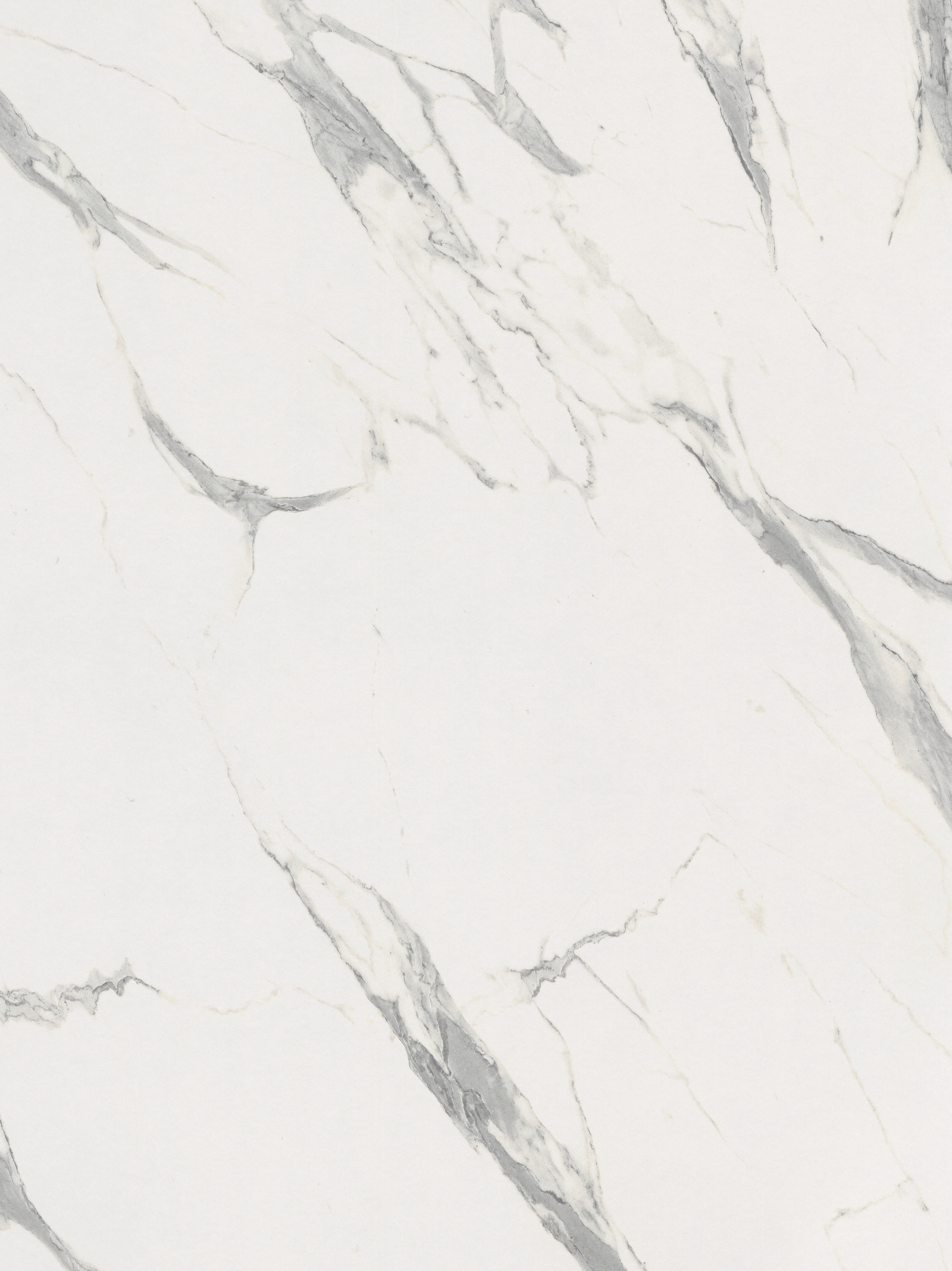 De Talco structuur is glad en heeft een ultra matte finish. Het decor heeft de karakteristieke uitstraling van Carrara marmer in wit met lichtgrijze aders.