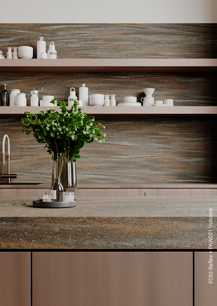 Decor FC93 laat een subtiel kleurverloop van licht naar donker brons zien, dat afwisselend in verticale banen in elkaar overvloeit. In combinatie met de subtiele metallic finish in de Reflex structuur van Cleaf ontstaat decoratief plaatmateriaal met een stijlvolle uitstraling.