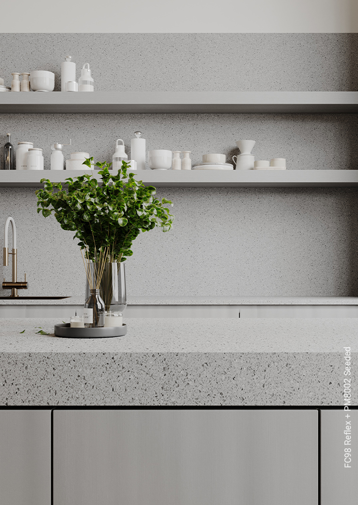 Decor FC97 laat een subtiel kleurverloop in warm grijs zien, dat afwisselend in verticale banen in elkaar overvloeit. In combinatie met de subtiele metallic finish in de Reflex structuur van Cleaf ontstaat decoratief plaatmateriaal met een eigentijdse uitstraling.