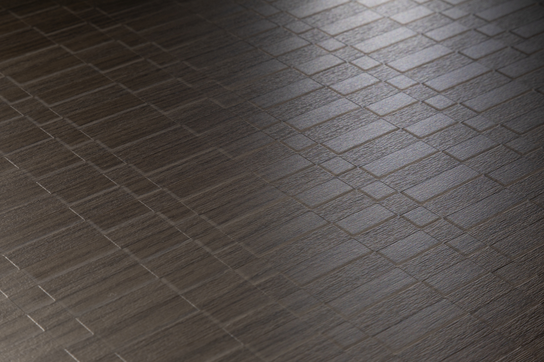 De donkerbruine S181 Sbalzo van Cleaf toont een geometrische structuur die is geïnspireerd op artistieke houtbewerking. Het driedimensionaal effect versterkt de perceptie van diepte. De structuur wordt gecombineerd met decor S181 – welke we kennen in de Quercia structuur.