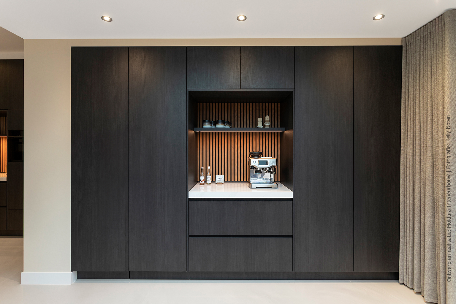 De S182 Quercia van Cleaf is vergrijsd zwart. De voelbare synchroon structuur vindt haar oorsprong in eikenhout. De platen hebben aan beide zijden structuur Quercia, waardoor deze geschikt is voor een verwerking in open kasten. Nieuw in de collectie is de grafische S182 Sbalzo, welke perfect combineert met de S182 Quercia.