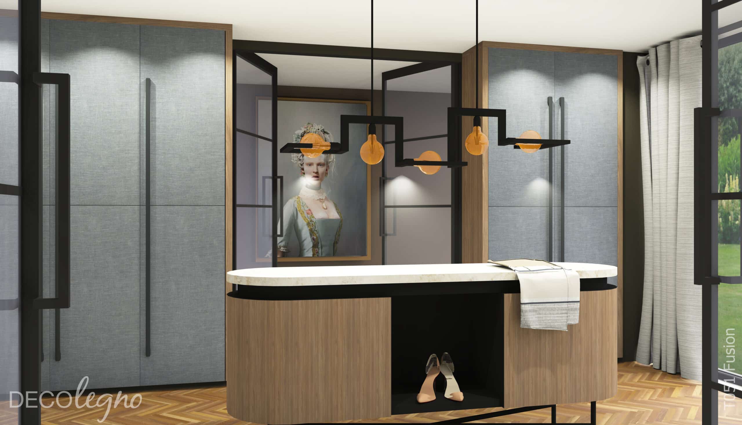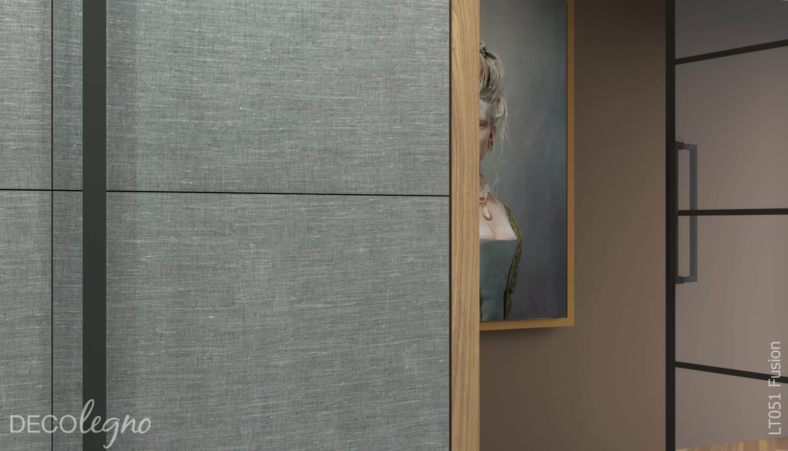 Render hoge kast in salon in decoratief plaatmateriaal decor T051 Fusion denim linnenstructuur