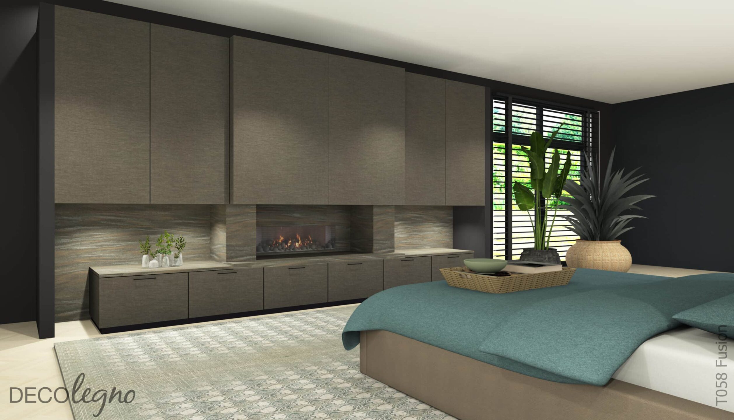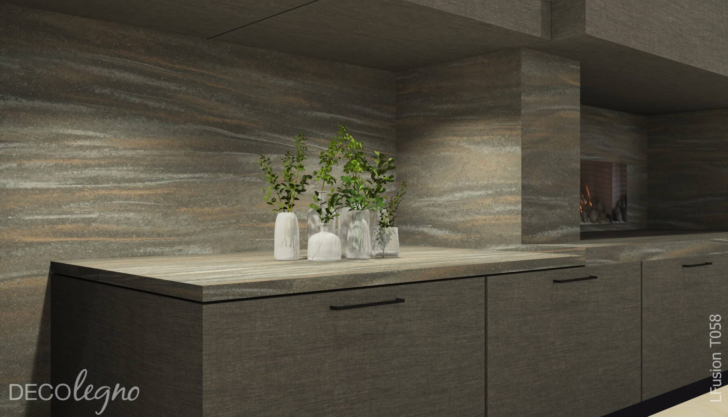 Textuur Fusion van Cleaf is ontwikkeld voor het creëren van high end interieurconcepten. Een intensief onderzoekstraject - zowel op esthetisch als op technisch vlak - heeft geresulteerd in een innovatieve productiemethode die het mogelijk maakt om textiel te verwerken in plaatmateriaal. Op deze productiemethode heeft Cleaf een Europees patent verworven (EP 2 189 298 A1). De perfecte hechting van de stof aan het oppervlak maakt een verticale toepassing in meubelen en wandafwerkingen mogelijk. De ongekende schoonheid van T058 Fusion geeft op speelse wijze een gevoel van stijl en luxe aan ieder interieur. In 2021 is Fusion bekroond met de Design Award van Archiproducts. T058 is een natuurlijke, bruine linnentextuur en drager FA44 Penelope zorgt voor een lichte ondergrond.