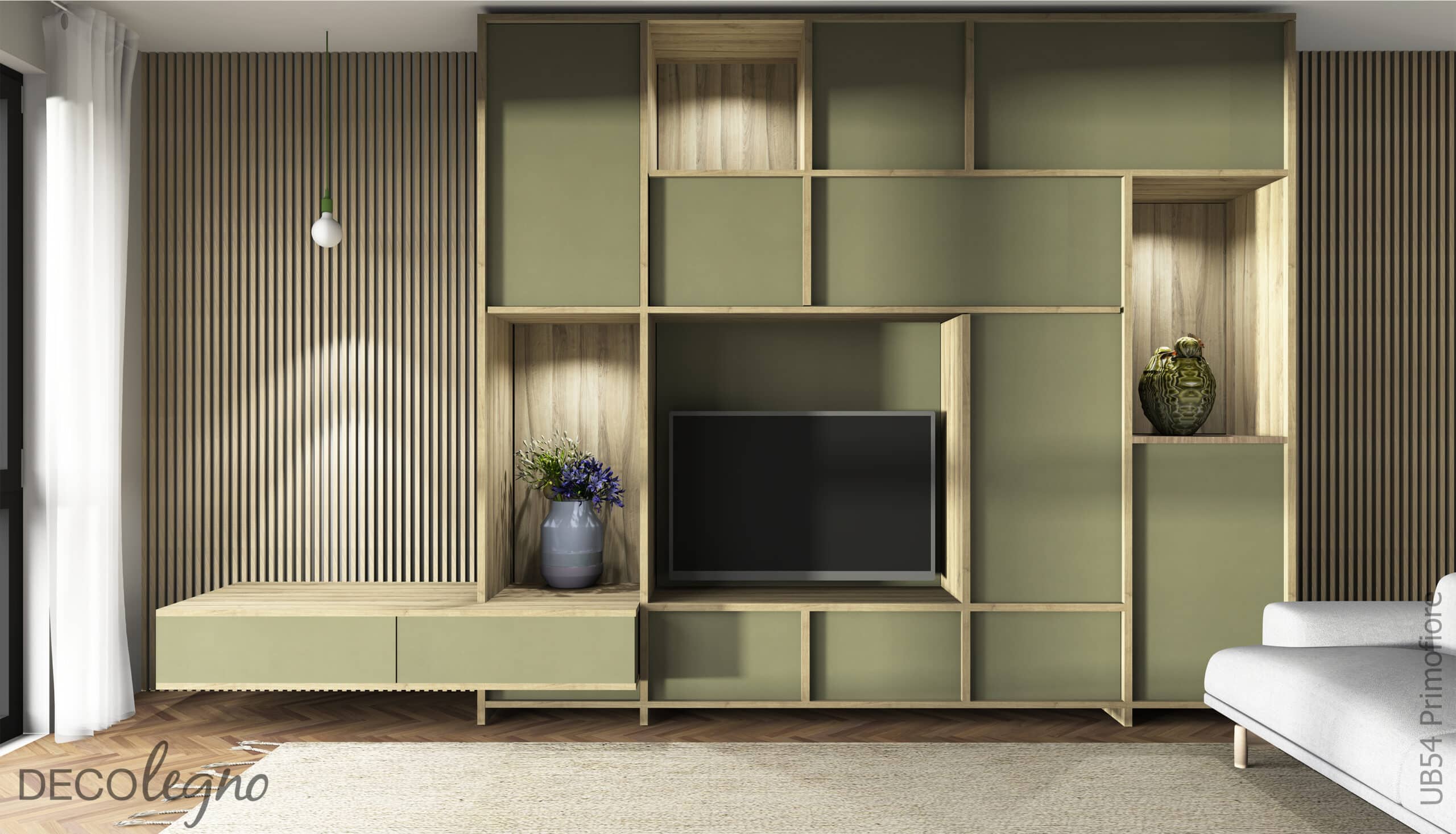 Render van een detailafbeelding van een kastenwand uitgewerkt in het legergroene decoratieve plaatmateriaal UB54 Primofiore van Cleaf inclusief televisie en bloemenvaas