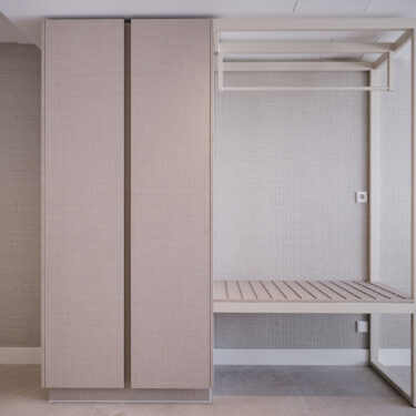 De kledingkast én het meubel onder het wastafelblad zijn afgewerkt in FC31 Alpaca een lichte beige textuur met de uitstraling van fijn geweven textiel. De matte, natuurlijke vezelstructuur voegt een zachte, tactiele laag toe aan het interieur en brengt warmte in de ruimte.