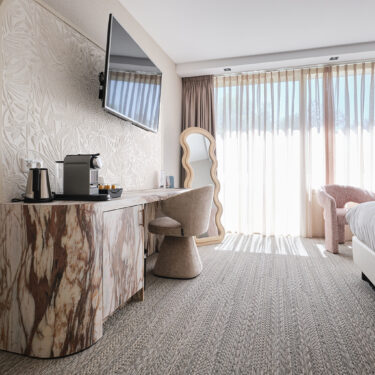 Samen zorgen deze materialen voor een harmonieus geheel waarin warme tinten, afgeronde lijnen en verfijnde details elkaar versterken — precies de sfeer die je in een moderne hotelkamer zoekt.