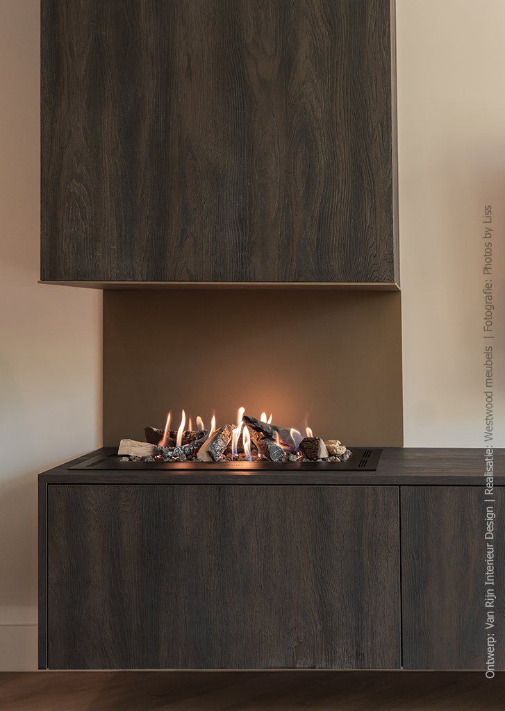 Wanneer je deze woning binnenstapt, valt meteen de harmonie op. Alle maatwerkonderdelen – de kastenwand met open vakken en het wandmeubel met de ingebouwde haard – zijn uitgevoerd in hetzelfde decor S171 Bruciato. Daardoor ontstaat een rustige basis waarin de verschillende ruimtes vanzelf met elkaar in verbinding staan.